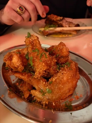 Boy did we choose a great path! Some of the messiest foods are always the best foods, SO unless you feel comfortable licking your fingers, lips and practically everything the ribs touch, do not order these on a first date. Topped with ribboned scallions and peanuts, as well as some pickled cucumbers for coloring on the plate, Even without those items, I am certain I would have enjoyed these ribs! (In fact, I did not particularly care for the cucumbers - I get it, palate cleanser and all, but for me, not a fan). The scallions and peanuts on top, however, did add another element of crunchy to the slightly caramalized crunch from the tamarind glaze. This is the kind of dish that will make you forget you are on a date as you lose all class and want to lick the plate clean. So. Freaking. Good. The sweetness plays so well with the savory of the ribs, which are also cooked to perfection. Each bite was like biting into melty butter, so soft, and barely hanging on to the bones. Along with the wings up next, you will want to come here by yourself, just so you don't have to share!